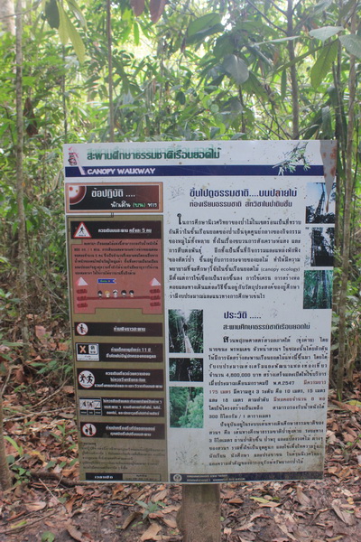 พอถึงเรือนยอดไม้ ก็จะมีป้ายอธิบายถึงข้อปฏิบัติและการขึ้นไปดูบนเรือนยอดไม้ค่ะ ระหว่างที่เดินไป บรรยากาศ 2 ข้างทาง ได้ยินเสียงจั๊กจั่น ส่งเสียงร้องเรไร สลับกับเสียงนกร้องเจื้อแจ้ว ที่เวลาก็ไกล้จะพลบค่ำแล้ว